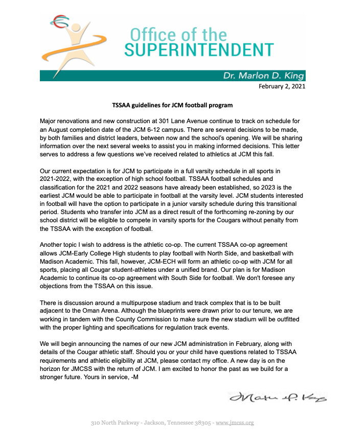 The following is the letter Jackson-Madison County School Superintendent Marlon King released Tuesday about the TSSAA guidelines for JCM football program: